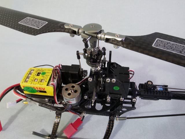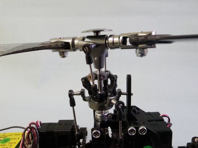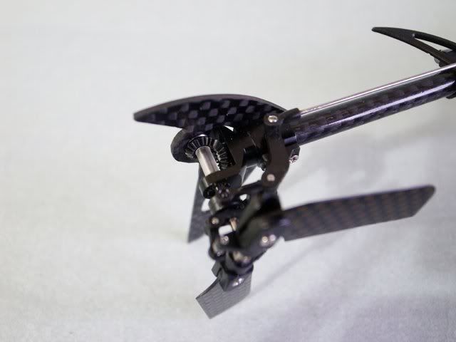 旋翼頭與 V120D02 一樣,不過這個陽極處理的顏色很漂亮。但因為機身設計不同,主軸就不一樣了。主旋翼是貨真價實的碳纖槳,飛起來的破空聲與塑膠或發泡槳完全不同。