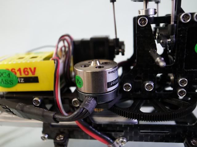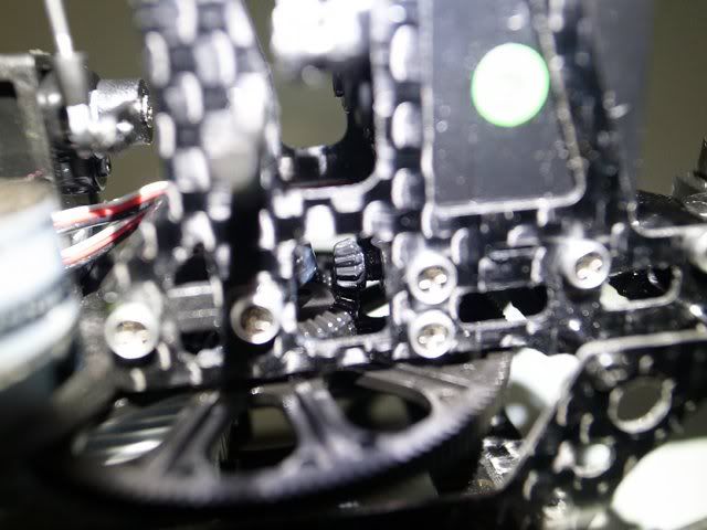從側板往裡看,可以看到尾傳齒與主齒的配置。這版為了改善精確度,尾軸不再是一支可撓性很高的碳纖棒,改成一支金屬棒。主齒輪也做了加強,與 V120D01的不同。可惜,不變的仍是尾傳用了同一顆傘齒...
