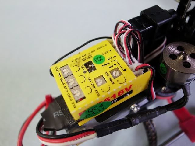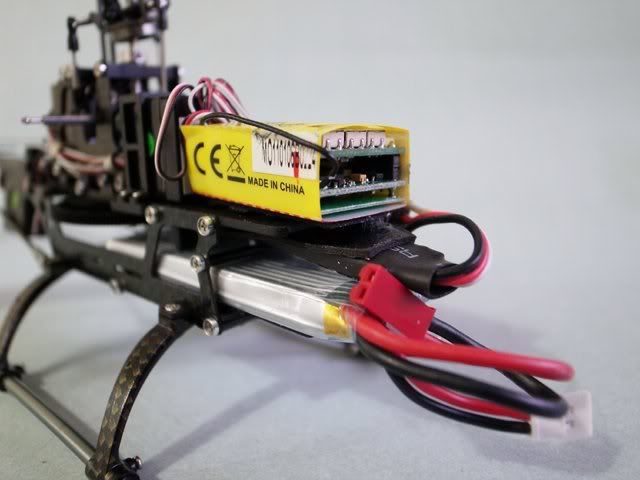 電池是850MA,20C的長型鋰電,充電頭與放電頭是不同的。電變夾在電池與接收之間,感覺位置不好。或許將來改馬達時把它移到機身正下方也不一定。