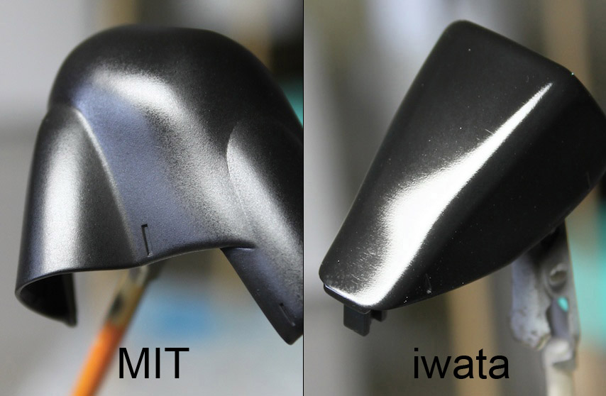 最後,兩者皆使用相同比例溶劑與漆種來實際操作噴漆比較效果(下圖),我認為MIT噴筆霧化效果比iwata好,由於MIT霧化效果太好再加上噴幅廣、出漆不集中也容易煙霧瀰漫,因此噴在目標位置時目標區旁邊會有薄霧噴漆先吃色,先吃色的部份乾的很快,所以噴一輪之後漆膜就呈現出顆粒狀;而且試過幾種不同出氣量、出漆量之後亦得到相同結果,屢試不爽(真的很不爽~);最後還是請出iwata噴筆來完成,各位可以比較一下兩者再漆膜表現的差異。