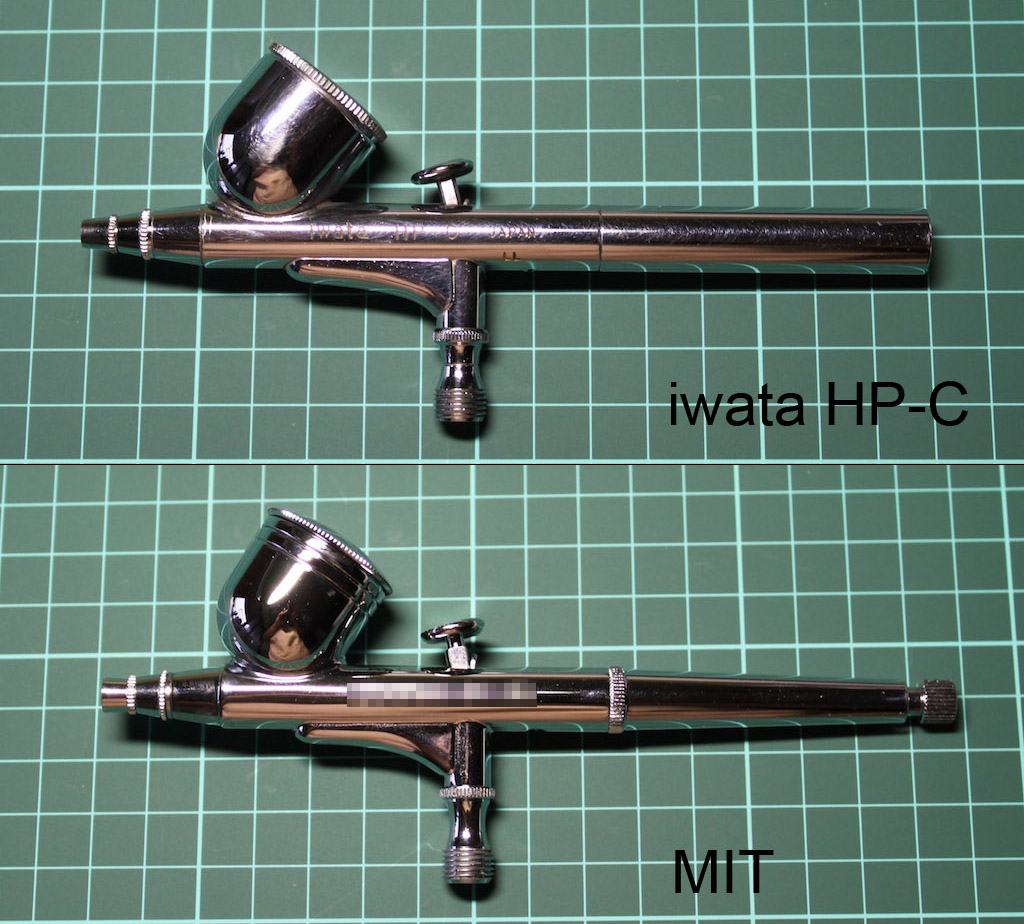 先來相互比較一下MIT與iwata噴筆的各項差異。首先從外觀上看(下圖),MIT的噴筆身形比較流線,且較為修長,重量比iwata輕,握感還不錯,而MIT噴筆比iwata噴筆多了尾巴的漆量調節鈕;第一眼看到我打從心理喜歡它更勝於iwata。