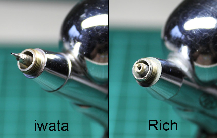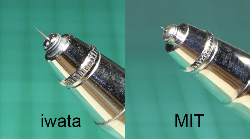 比較一下頂針(下圖),兩者同是0.3的噴筆,但由於iwata的頂針比MIT的頂針多出約3倍長度,這表示MIT漆量可調節段數將少於iwata;比方說0~0.3(全關到全開)iwata比較容易做出細微的變化,而MIT噴筆可能就比較困難了。