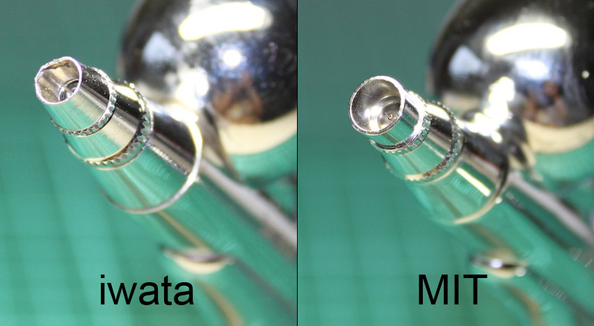 繼續比較一下噴嘴(下圖),MIT原搭配的噴帽是圓柱狀,它比iwata的噴帽開口更大一些,哪一個好勒!?我對這個沒有深入的研究,只知道開口越大、最大噴幅就越廣。