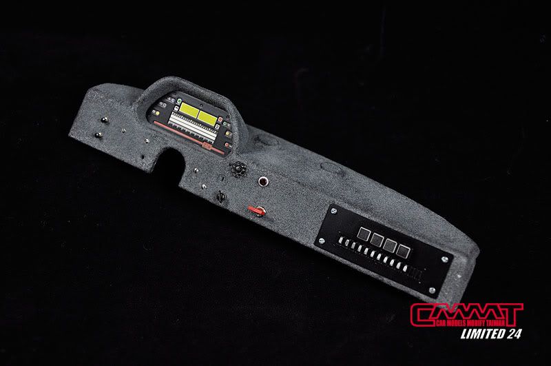 在很不願意的狀況下,選擇了好友阿傑代理的韓國植絨粉來增加效果,效果不錯,不過要是放到比例比較小的模型上,不知道會不會顯得纖維太粗,追加了一些自製的小開關,以及套件的蝕刻片,大概就將賽車化的簡單儀表版完成