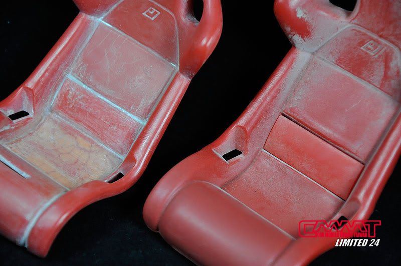 搞定儀表版後,開始進行椅子的製作,市售車有兩張桶椅,賽車化後,只剩下置放一張的空間,所以另一張就可以收起來了,不過原廠令人蠻匪夷所思的分件,就是右邊那張腰部的地方竟然是一個蓋子狀的零件,裝上去後有很離譜的落差跟細縫,這分件對組裝根本沒影響,所以左邊那個就是我調整好後補上補土,並雕刻整型後的樣子,這樣就不會有怪怪的細縫出現,至於為什麼那麼髒,這就不要問我了,我拿到就這樣了,補土痕洗也洗不掉XD