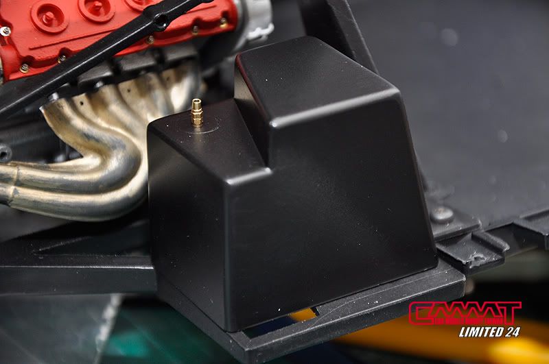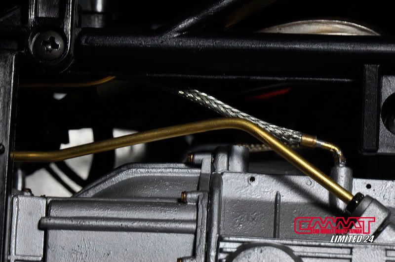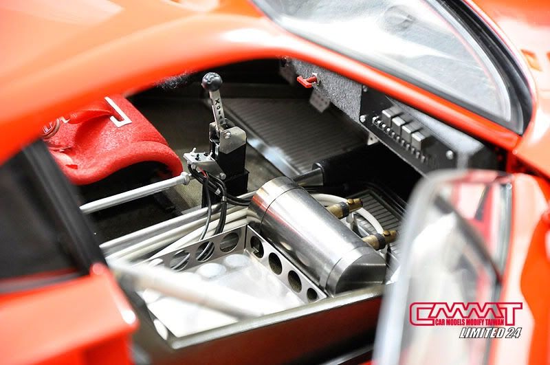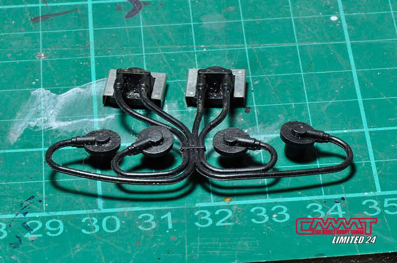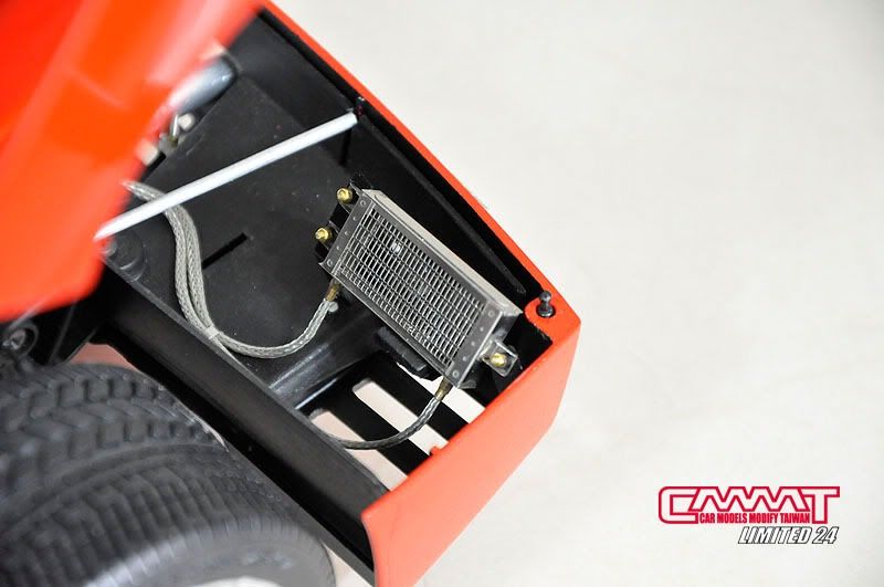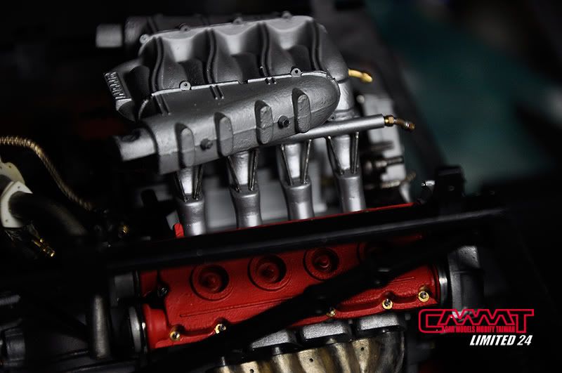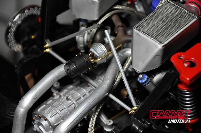 車殼像這種大傢伙,得請出外面烤漆廠的專業比較好,自己烤只會灰頭土臉,所以就丟給專業的汽車烤漆廠來進行,到時候就會亮晶晶的回來囉~所以我開始進行引擎室的改造,引擎是很多東西是找不到現成的改套來進行改裝,1/8的比例改套更是稀少,找不到的零件但又想有好效果就得自己生,所以開始製作一些零件,尤其是所有管路的部分,參照了真車的使用保養手冊,所以花很多的時間精神牽管牽線,盡量以真車的配線管下去重現為基本原則,但是當然不可能全部重現啦~意思到就好了XD
