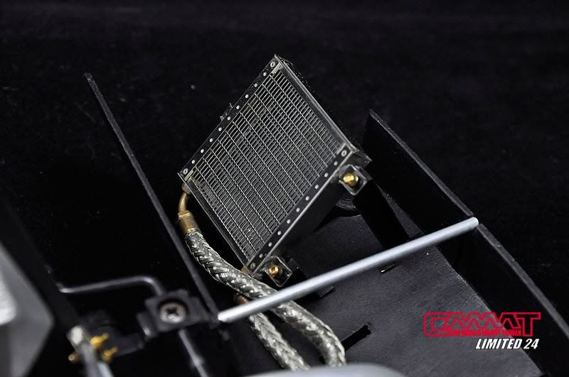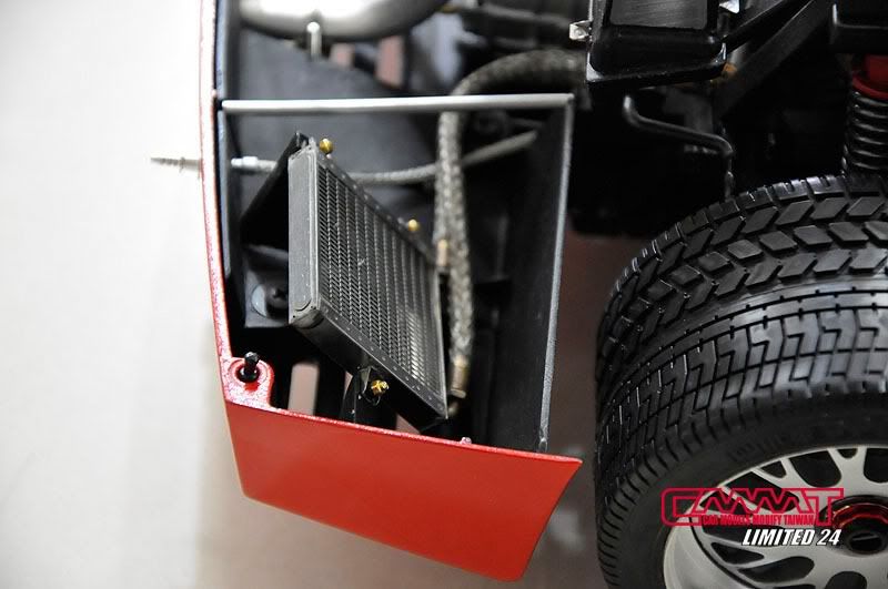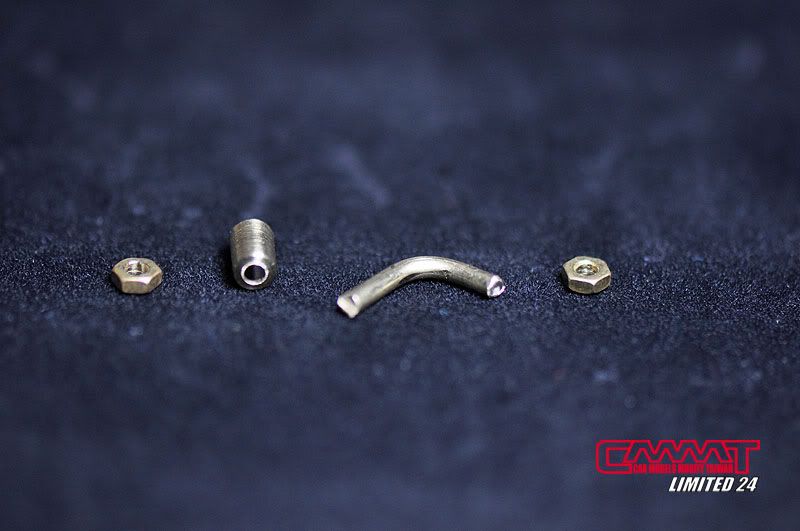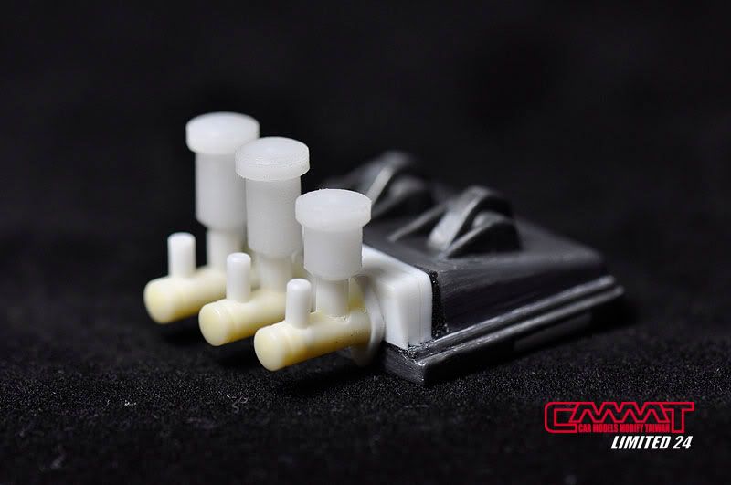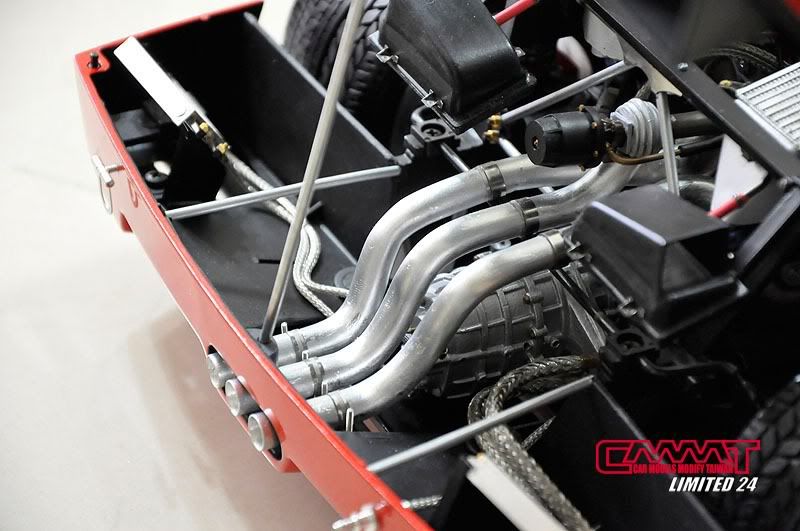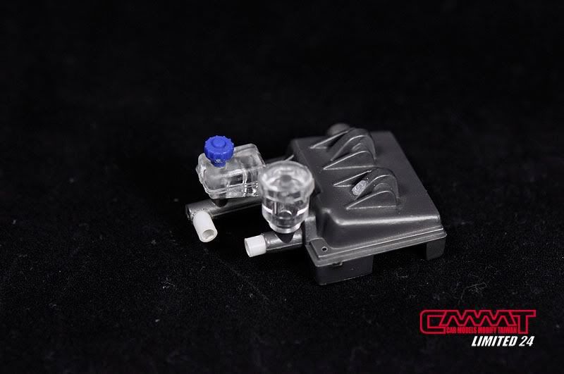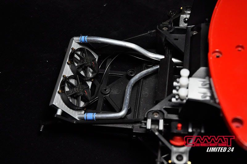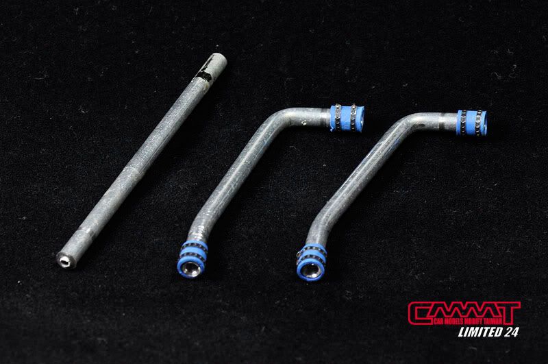 車殼像這種大傢伙,得請出外面烤漆廠的專業比較好,自己烤只會灰頭土臉,所以就丟給專業的汽車烤漆廠來進行,到時候就會亮晶晶的回來囉~所以我開始進行引擎室的改造,引擎是很多東西是找不到現成的改套來進行改裝,1/8的比例改套更是稀少,找不到的零件但又想有好效果就得自己生,所以開始製作一些零件,尤其是所有管路的部分,參照了真車的使用保養手冊,所以花很多的時間精神牽管牽線,盡量以真車的配線管下去重現為基本原則,但是當然不可能全部重現啦~意思到就好了XD
