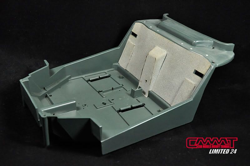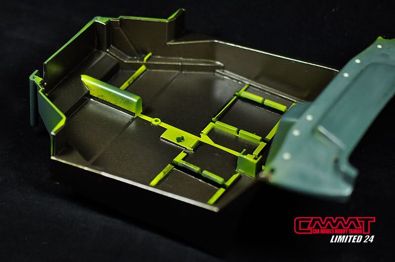 內裝經過阿呆似的想以乾掃的方式表現出Carbon紋路,最後當然是失敗,只能花費三大張carbon水貼,才能表現出想要的好質感,三大張我也不知道分了幾張下去拼貼,才完成所有看的到的地方的水貼工作,沒貼到的地方就是會裝上零件,或者是要噴上半光澤黑級植黑絨,到時候會是看不到那些怪怪的綠色XD