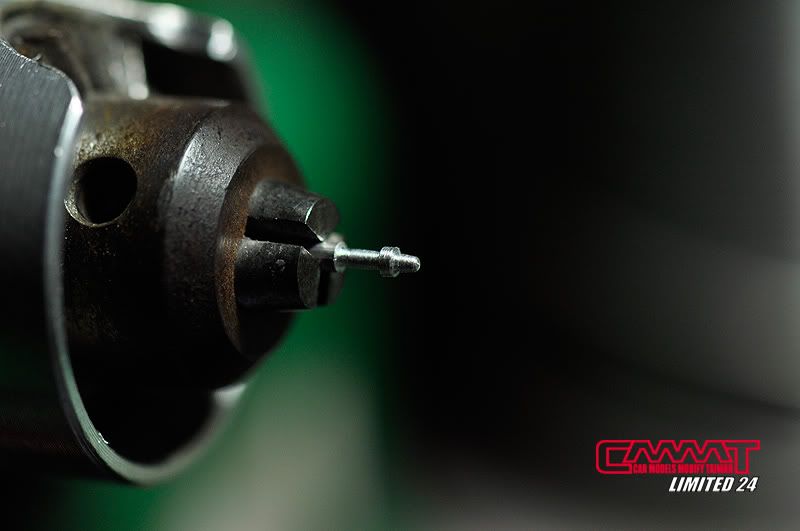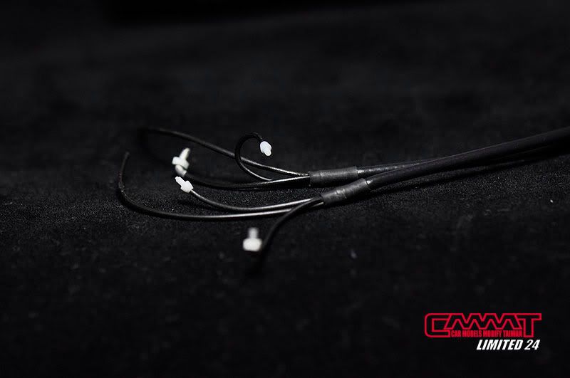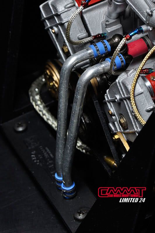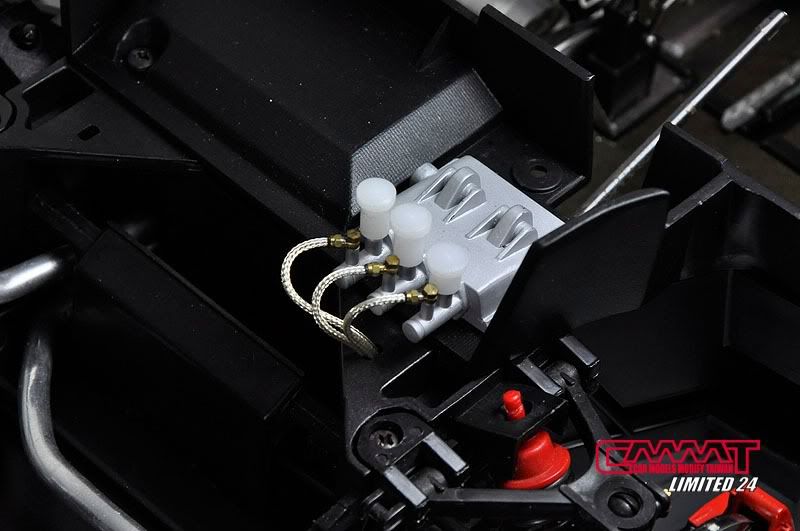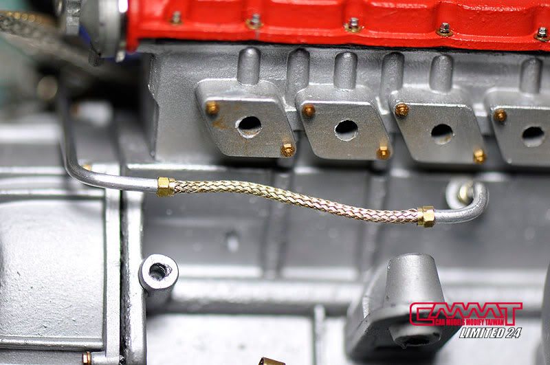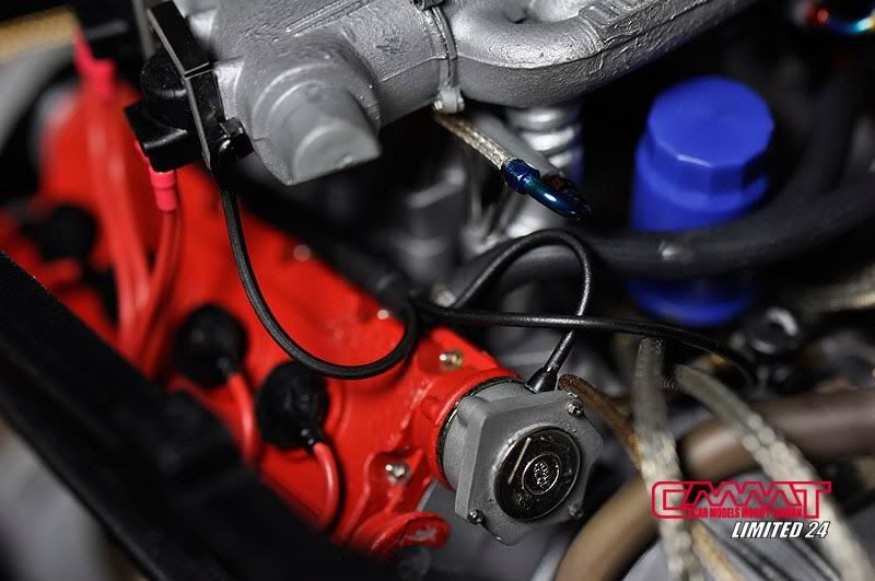 油管完成後,就開始牽電系部分的線,當然很多接頭是沒有的,所以自製車削品就又上場了,參照真車手冊資料所增加的電系接頭,不是照自己的意思亂牽一通,比照真車豐富資料的所有管線,就會讓引擎室有如真車般的感受,顏色當然也要比照真車重現,一般配線該是黑的就是黑的,矽導線該是紅的就是紅的,這點我到是還蠻堅持的,比較不會失去真實的感受囉~