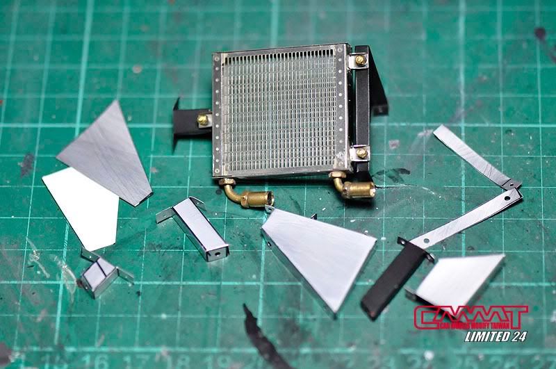 以前在製作比較小比例的模型時,很多管線其實小到根本找個地方藏起來就可以,但是這台實在是太大台了,空間根本不是問題,很多管線根本藏不住,就以油管來說,最終是接到油箱理,但是諾大的引擎室裡沒有作出油箱,你說怎麼辦?總不可能看到油管末端在那邊晃阿晃的吧>"<,所以我只好利用膠版製作出兩側的油箱,為的就是油管的落腳處啊