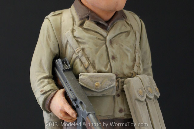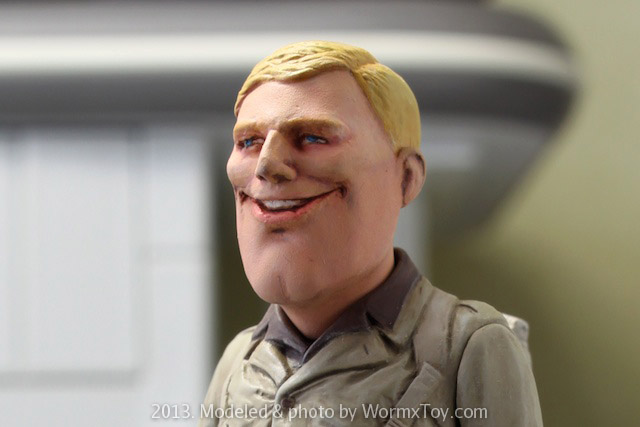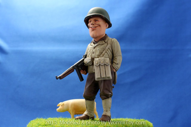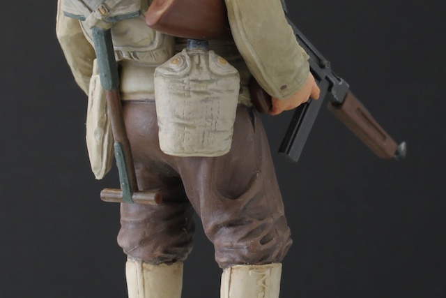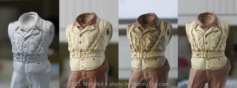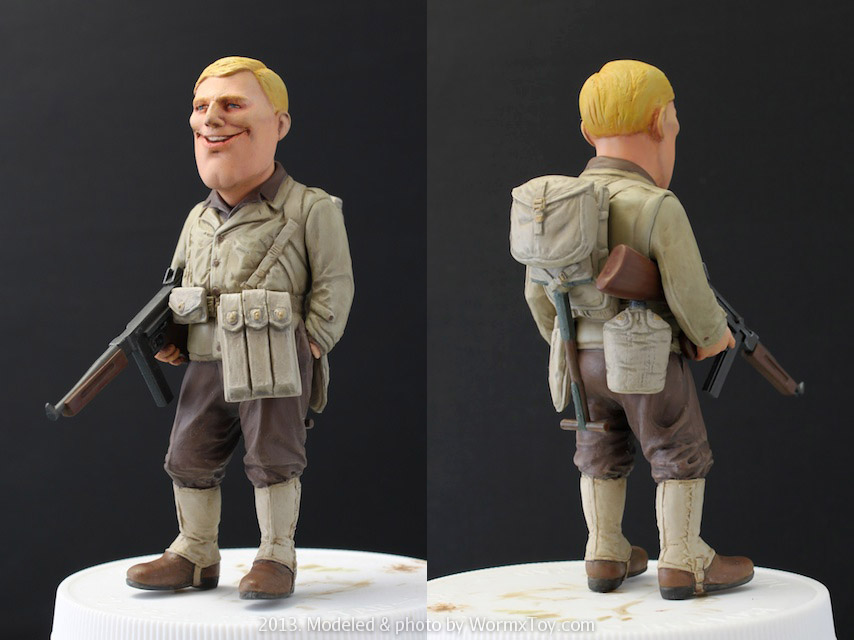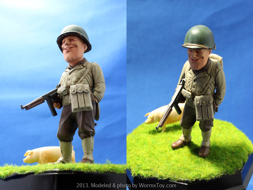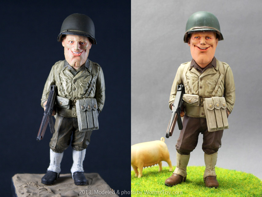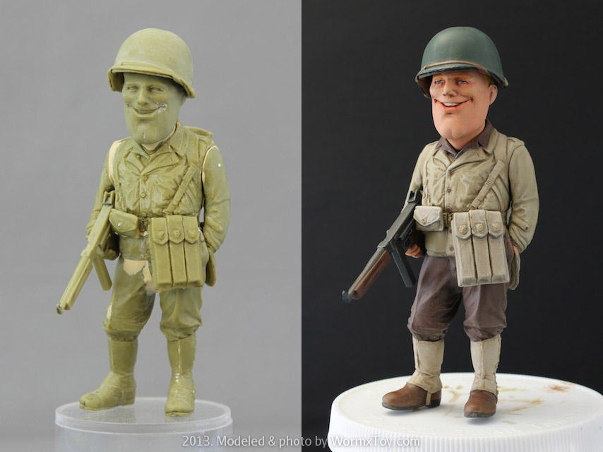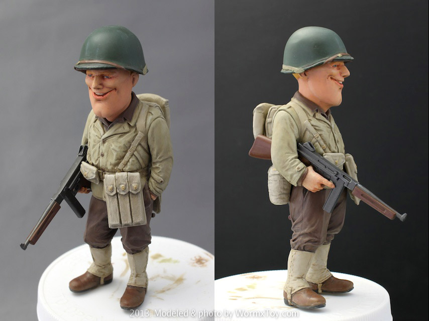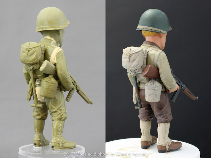 這個老模型套件是 Fine Molds 於 1993年所出品,由知名漫畫家鳥山明監製一系列 1/12 搞笑版軍事人形的其中之一,我已經忘記這個模型是何時入手的,反正我當時只是沖著鳥山明監製而買了它,但我卻沒有好好待它;從這張舊照片(上圖左)相信大家不難看出我上色也只是亂塗一通罷了,就過去成品看來我當初似乎只會平塗與乾掃而已。