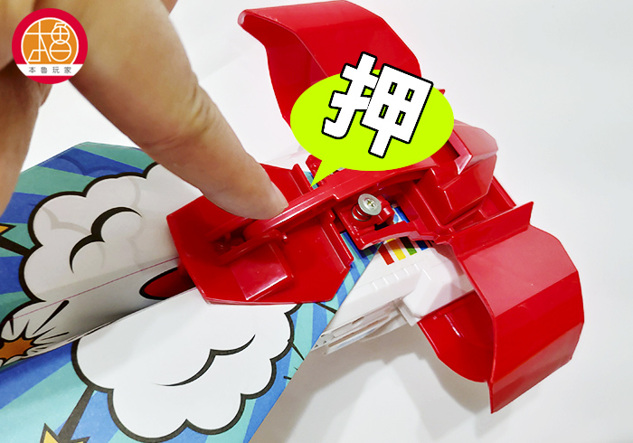 往前卡住之後板機固定飛機,圖中有色條的部分紅黃綠藍,將飛機的頭頂到藍色條的位置即可,不要太前也不要太後。