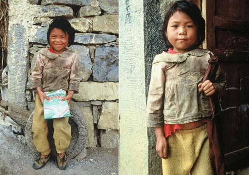 (64.)曹會龍,今年八歲,貴州省峨嘎村小學學生,這是他最寶貴的:“一個布書包” 原因他沒有回答,只是靦腆的微笑著。會龍沒有布書包,為了拍照他向同學借來一個。他自己的書包是一個四百克洗衣粉塑料包裝袋。會龍的一天在早上六時起床吃早飯,八月至二月吃粟米或三月至七月吃