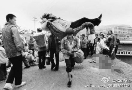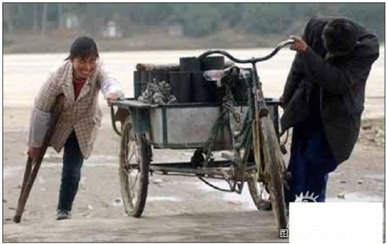 (94.)老電影裡似曾相識的鏡頭,一對帶著孩子在外地的農民夫婦,在北京街頭一家快餐廳前向過路人叫賣兒子。在他們肩上的孩子手中的紙牌上寫著:「 孩子被汽車壓傷已成殘疾,他們無能力追究肇事者的責任,也撫養不起小孩,期望好心人能收留。
