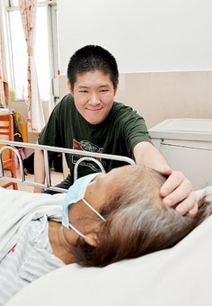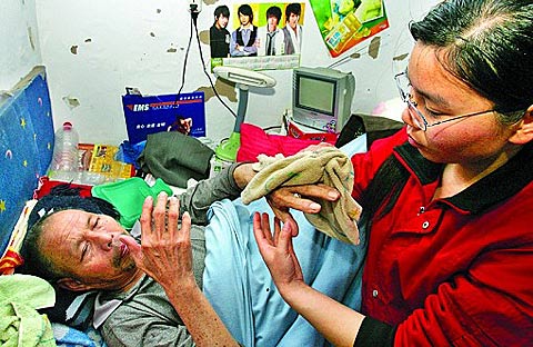 (74.)福建晉江一位孝子洪祖龍,為了照顧中風的老母親,不給家裡增加負擔,直到58歲依舊單身未娶。自從8年前母親中風後,老洪每天洗衣做飯,餵母親吃飯,幫她擦身,端屎端尿,每天換洗10幾次尿布,也不願其煩。