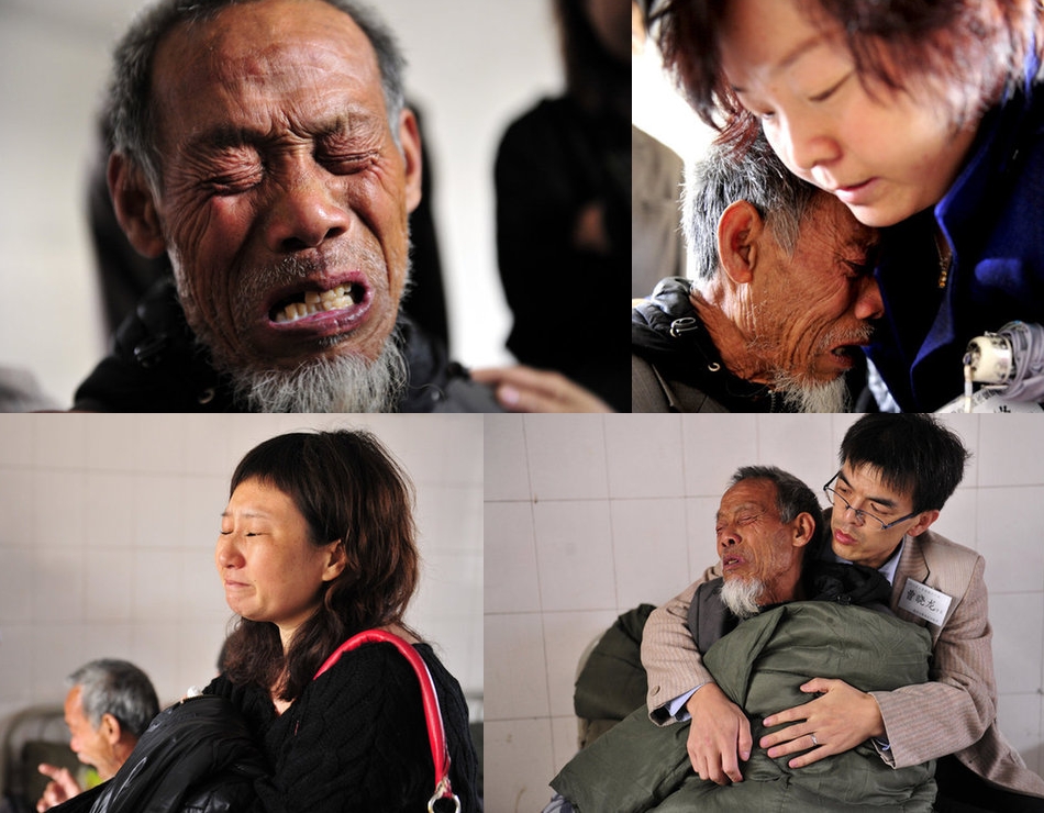 (44.)10月26日在西安市救助站,不少愛心人士趕到救助站看望在外流浪了近50年的賀貴立老先生。老先生當得知自己能回到家鄉了,失聲痛哭。愛心人士曹先生說,誰都有老的時候,我們來看看他,讓他感受到溫暖,讓他知道他沒有被社會遺棄,讓他不要失去活下去的信念。當曹先生擁抱老先生的時候,老先生泣不成聲,在哭泣中說出了「謝謝」的話來。賀貴立老人回到陝西省白河縣的家鄉後,其生活事宜將由當地民政局安排。