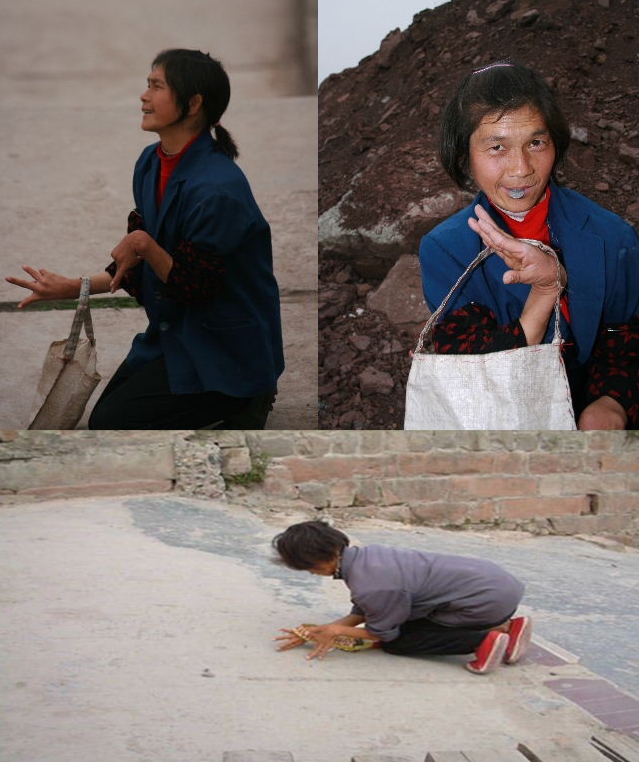 (72.)她是一位患有先天小兒麻痺症的媽媽,不論刮風下雨她都每天在碼頭用自己殘疾的手腳來給他的兒子掙取學費。有時看到地面上有人掉的錢幣,她唯一的方式就是用嘴把它撿起來,面對這樣的生活,她從未流淚。談起她上高中的兒子她淚流滿面,她告訴我,她最大的希望就是看到他的兒子能上大學。