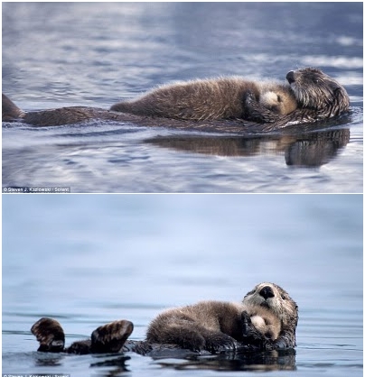 (47.)小水獺在媽媽肚皮上睡著了!這溫馨的場面發生在美國阿拉斯加州南部海岸地區,陽光明媚的一天,水獺媽媽打算帶寶寶到河對岸去,但是困倦的水賴寶寶可不願辛苦游著過河。於是,水獺媽媽把寶寶放在了肚皮上,“仰泳”抵達河對岸,水獺寶寶全程靜靜的睡著。這一幕被攝影師史蒂文·卡茲洛斯基拍攝了下來,上傳到網上後,溫暖了無數人的心,就連動物都有著偉大的母愛。