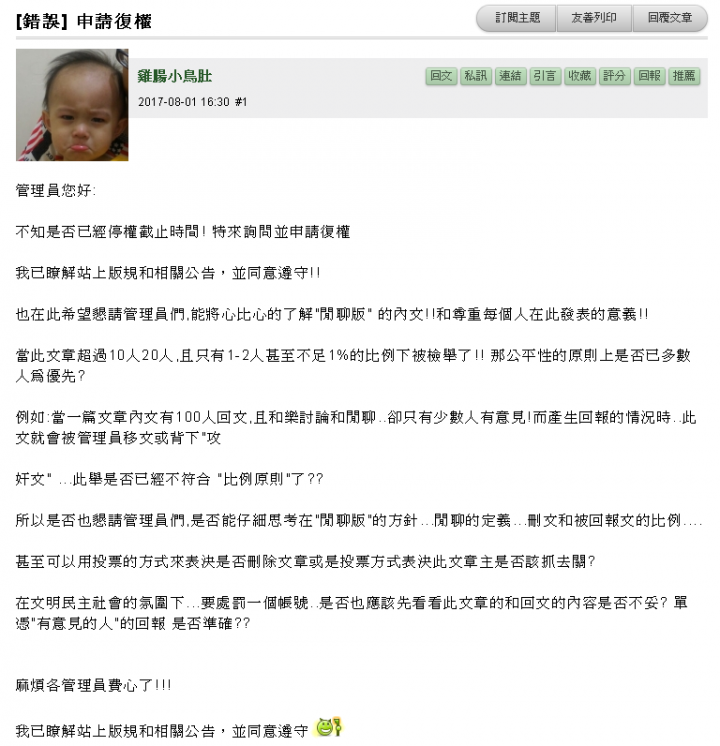 dodoyo wrote:2017-06-30 13:20 #1會員"雞腸小鳥肚",停權30天