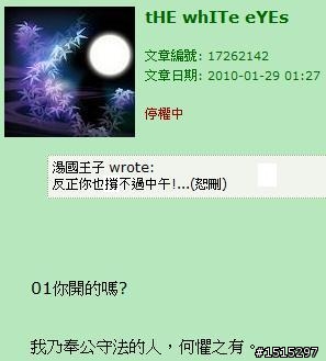 大俠愛吃羊肉爐 wrote:白眼兄弟為什麼要一次...(恕刪) 各位可不可以不要在這個版討論分身的問題,對這個話題很有興趣可以再開一版,因為說老實的分身這個話題,沒建設性沒意義到了極點,我連想花0.01%的大腦cpu在上面都覺得浪費,不懂怎麼有人會花許多精力在研究這種無聊的梗,是想不出新梗嗎? 想不出來ok,可以pm我,我幫你想梗,我很會想梗的。另外,有人要說阿揪北鼻是我的分身,也不看一下人家註冊的時間比我還早,如果同網段都是分身,那我辦公室30幾個潛水的同事都是分身了,停權我是不會怎樣,但如果我同事被莫名其妙被停權,導致他們權益受損我就不知道他們會不會採取反制行動了,阿揪北鼻可是很凶的喔。