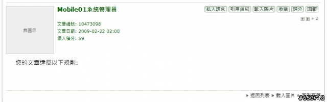 發財猴 wrote:除非...像這一位...http://www.mobile01.com/topicdetail.php?f=132&t=948044&p=1&cache=0那...後果自負(恕刪) 他..................到底是犯了哪一條呀?看不到..........是禁止餵食嗎?!