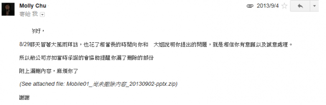 附加壓縮檔: Mobile01_尚未撤除內容_20130902-pptx.zip是有人忘了將抹黑新聞那篇給家樂福人事經理?所以她沒帶來我家?家樂福答應我提供新聞,可是要求我刪掉所有與家樂福文章,我怕會遺刪,所以告訴她們如有漏刪,請通知我家樂福完全不履行相關承諾,跟之前吃掉幾十位目擊證人那樣,想把那篇新聞給吃掉家樂福派來的法務叫我去跟他們家樂福總公司人事劉經理她解決,這代表什麼意思?