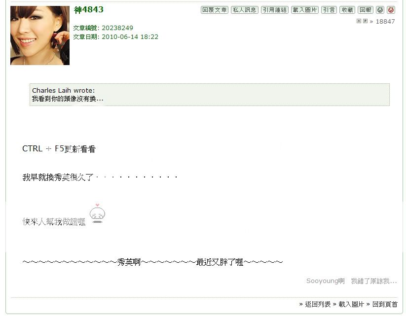 Charles Laih wrote:我看到你的頭像沒有換... CTRL + F5更新看看我早就換秀英很久了...........快來人幫我做證喔~~~~~~~~~~~~秀英啊~~~~~~~最近又胖了喔~~~~~