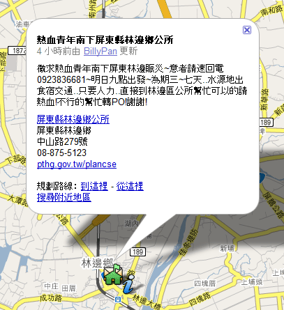 熱血青年南下屏東縣林邊鄉公所徵求熱血青年南下屏東林邊賑災~意者請速回電0923836681~明日九點出發~為期三~七天..水源地出食宿交通..只要人力..直接到林邊區公所幫忙可以的請熱血!不行的幫忙轉PO!謝謝!屏東縣林邊鄉公所屏東縣林邊鄉中山路279號08-875-5123pthg.gov.tw/plancse