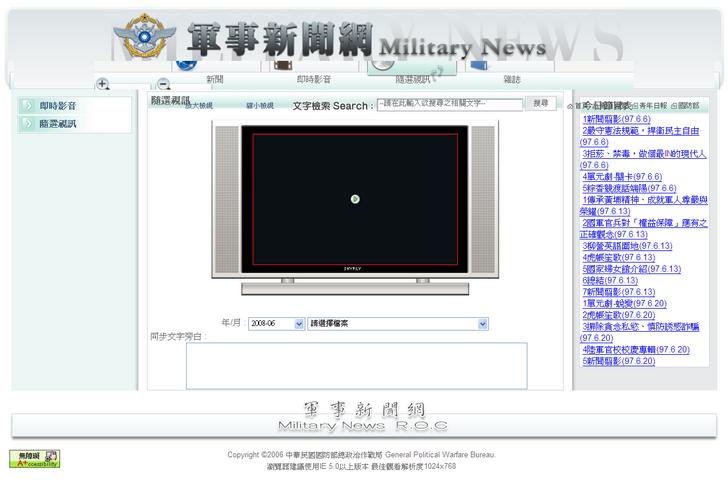 ~感謝大家對小林我分享好片的支持其實在「軍事新聞網」的「隨選視訊」http://news.gpwb.gov.tw/media.php?css=4就可以線上收視最新的單元劇&其他精彩單元喔!不過依小林我個人實際使用經驗-*使用IE瀏覽器可以正常收視沒問題(也有字幕),只是螢幕沒辦法放成「全螢幕」,也沒辦法快轉、邊找邊看;*如果您是使用Firefox瀏覽器,則點選欲收視之節目,會變成下載原始wmv檔,雖然沒有字幕,但是影片畫質較好~像【關卡】那一齣單元劇,就是小林我下載後再上傳無名分享的喔