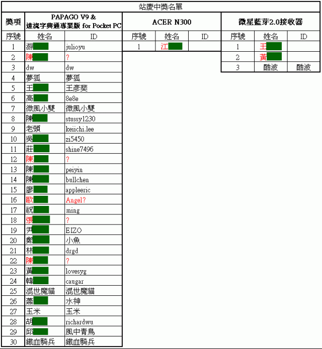 感謝站慶當天網友們熱情的參與。當天加碼的活動很多,而部份網友們也HIGH到忘了留下站上的ID,所以將名單公佈,姓名的部份,名字不公佈,以做為核對的依據,除了軟體的部份,會用站方PM及MAIL方式通知外,其餘商品部份得獎的網友,要麻煩以PM或MAIL 回覆收件資料。以下是得獎名單,請網友們務必要回覆給我:
