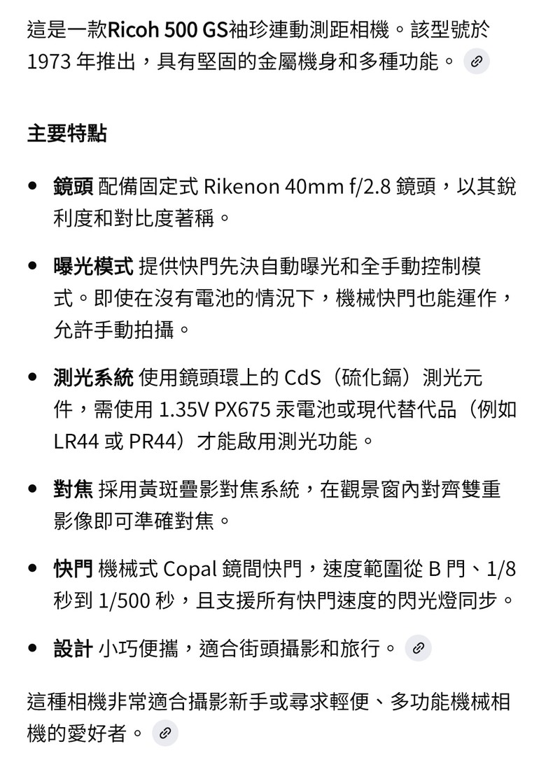 老何boss wrote:RICOH 500 GS輕巧 RF 底片相機.40MM.F:2.8鏡頭.可自動.手動曝光.此機為日本國內版.500 G為外銷版