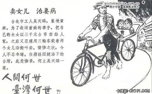 媒體人 wrote:老師都說對岸過著水深火熱的日子只能吃香蕉皮 想起之前看到有趣的圖片 \"賣女兒 治妻病\" 台北市工人吳天賜,家境貧寒。為了救活重病的妻子,把自己的長女以三千元台幣賣給人家,之後又忍痛用三輪車載著兩個女兒沿街叫賣。淒慘之狀,令人不忍卒睹。在蔣經國統下的台灣,此類慘景,何只吳天賜一家。 想必台北人過得也不好資料轉自台北真的好落後~!!! 很殘酷的 沒有心裡準備就不要點了