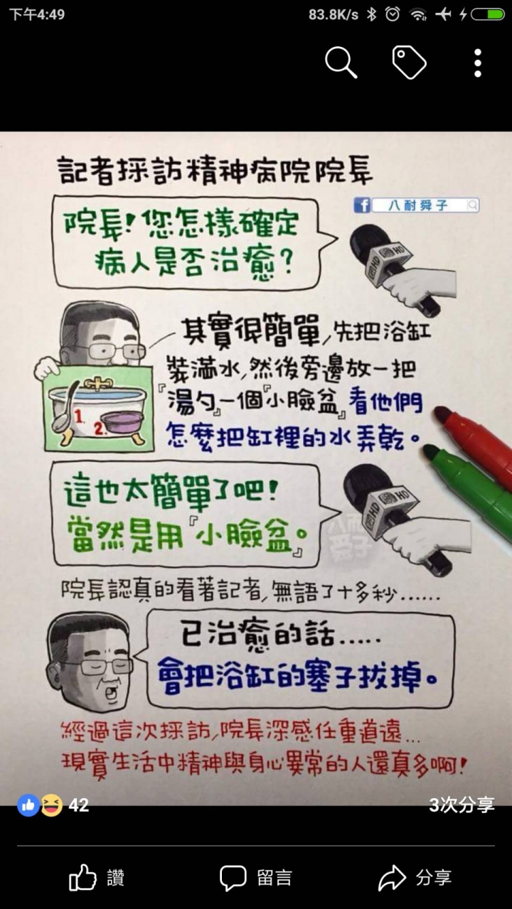 你還明白那表示你沒病我上次去看精神科醫生說 “把大頭切掉就好了”我說 “好!什麼時候做?”然後,他在病歷上寫下 “藥石罔效,束手無策!”卍南無阿彌陀佛卍 wrote:現在醫生在檢查我的屁股奇怪了?我不是掛精神科嗎?干我屁股什麼事啊