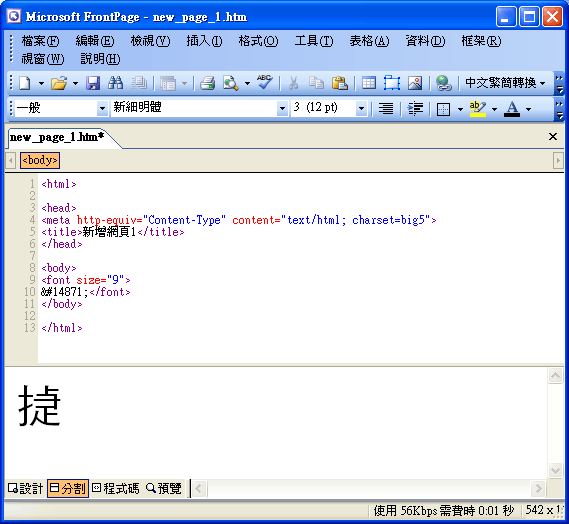 這個怪怪的第二個字,在我的XP 電腦上真的有這個字耶。只是打不出來。在FrontPage 的 HTML 編輯中輸入 Unicode 碼 14871,就會出現這個字了。不過複製再貼上,就會變成空格字『㨗』。換了台 Vista 的電腦,就可以看到這個㨗字了,大家用Vista的是不是也能看到呢?