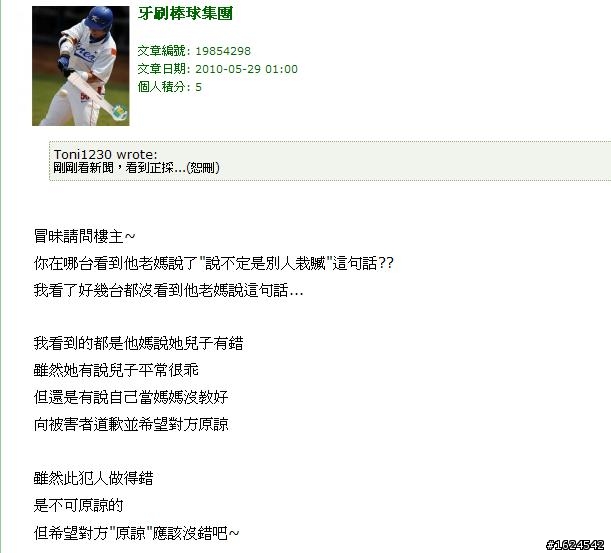 Toni1230先前發主題文時並未將此電視報導內容連結或轉載,就我之前知悉之新聞內容並無Toni1230所述其母親質疑他人栽贓,當然也許新聞報導內容各家不同,讓牙刷棒球集團誤解此內容為Toni1230加油添醋,但當有人找到完整報導內容後牙刷棒球集團亦未反駁而停止發言,事件就是資訊不同而發生誤會,又不是故意污衊有何需要道歉呢?我反而覺得現今樓主 skinnerlee有點吃飽沒事幹,不需將誤會小事小題大作吧。
