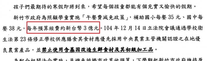 新竹市政府針對國中小學童的營養午餐提供補助,每年預算大約是三億。所以兩億大概就是三分之二的國中小學童的營養午餐補助費用。截圖來自2016年<新竹市學校午餐政策說明及問卷調查>。