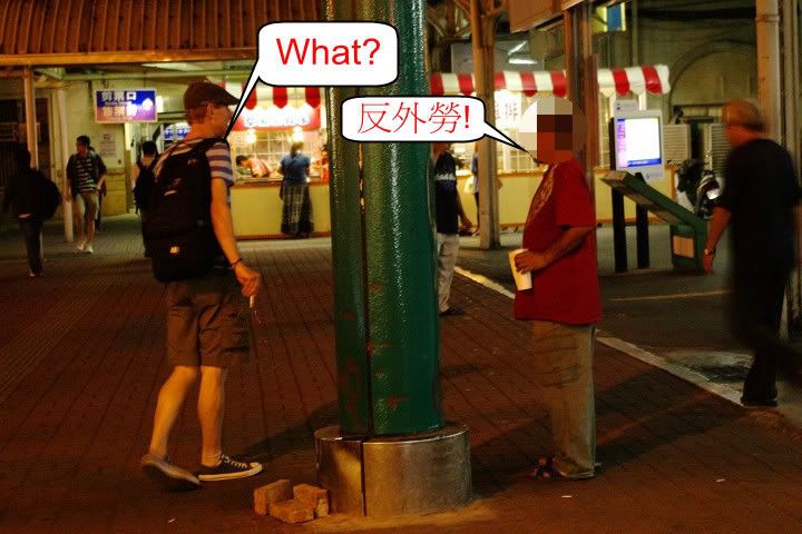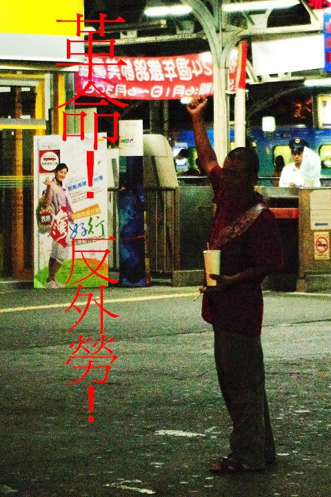 今天晚上跑去火車站的my飲料,老闆問我知不知道革命哥?據老闆消息指出,這位仁兄會三不五時喊革命表達訴求.....不過我想,去參加遊行還比較有意義,在火車站大喊實在有傷本市門面.....不止如此,還會糾纏旁人。喂!外國人不等於外勞啊!老外極欲想擺拖革命哥,無奈他老人家跟的很緊。台南火車站又有一頁傳奇了=_+