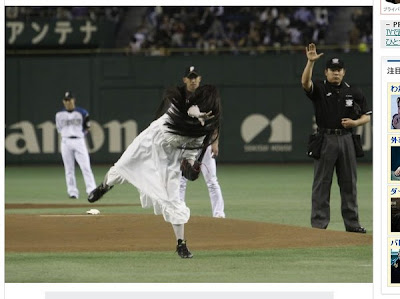 邀請辣妹或是女星來開球,現在已經不夠看了,25日的日本火腿隊在東京巨蛋面對羅德海洋,令人聞之色變的「貞子」,竟然出現在球場擔任開球貴賓,只是當「她」放話要執行「詛咒式」開球,觀眾卻是輕鬆以對,甚至貞子投完球突然趴到在地上裝死時,全場球迷無不笑翻。爆笑的影片-貞子投球