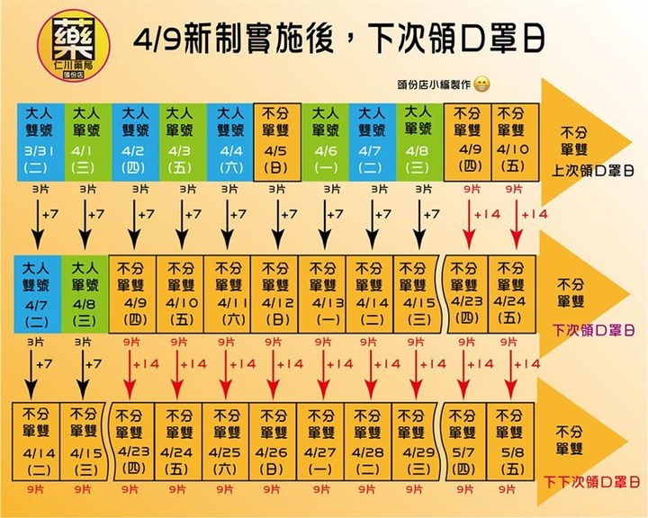 網友 wrote:自4/9開始改變為了每人兩周9片.本來是排周三買口罩的人,如果這周4/8號買到了,請問下次可買的日期何時開始 ? 我的話,週三跳過,週四買。creamlemon wrote:順便認真的問你為什麼不用網購 ? 我也不用網購理由是我這藥局很多除了一家,生意很好,其餘幾家,可以不用急著排隊。像上星期,沒去排隊,常去那家,沒了。喔...沒了,改去另一家,沒人排隊。買到了。