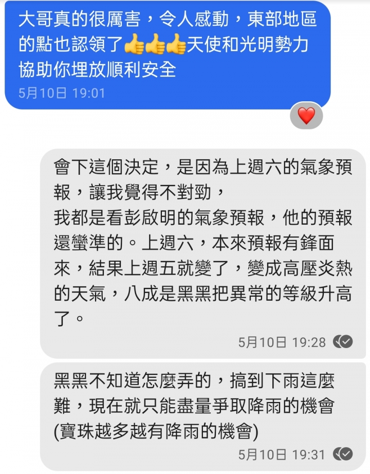 vn51 wrote:在完成全台水域寶珠(...(恕刪) 現在回顧與夥伴5月中(5/10)(當時寶珠還沒完全部署,剩下東部的寶珠還尚待部署)的對話,現在的降雨跟五月的降雨,已經是完全不一樣的情境。現在的午後雷陣雨要下個100 mm以上,是一件非常容易的事,感謝寶珠天使偉大的轉換天氣異常的能力。