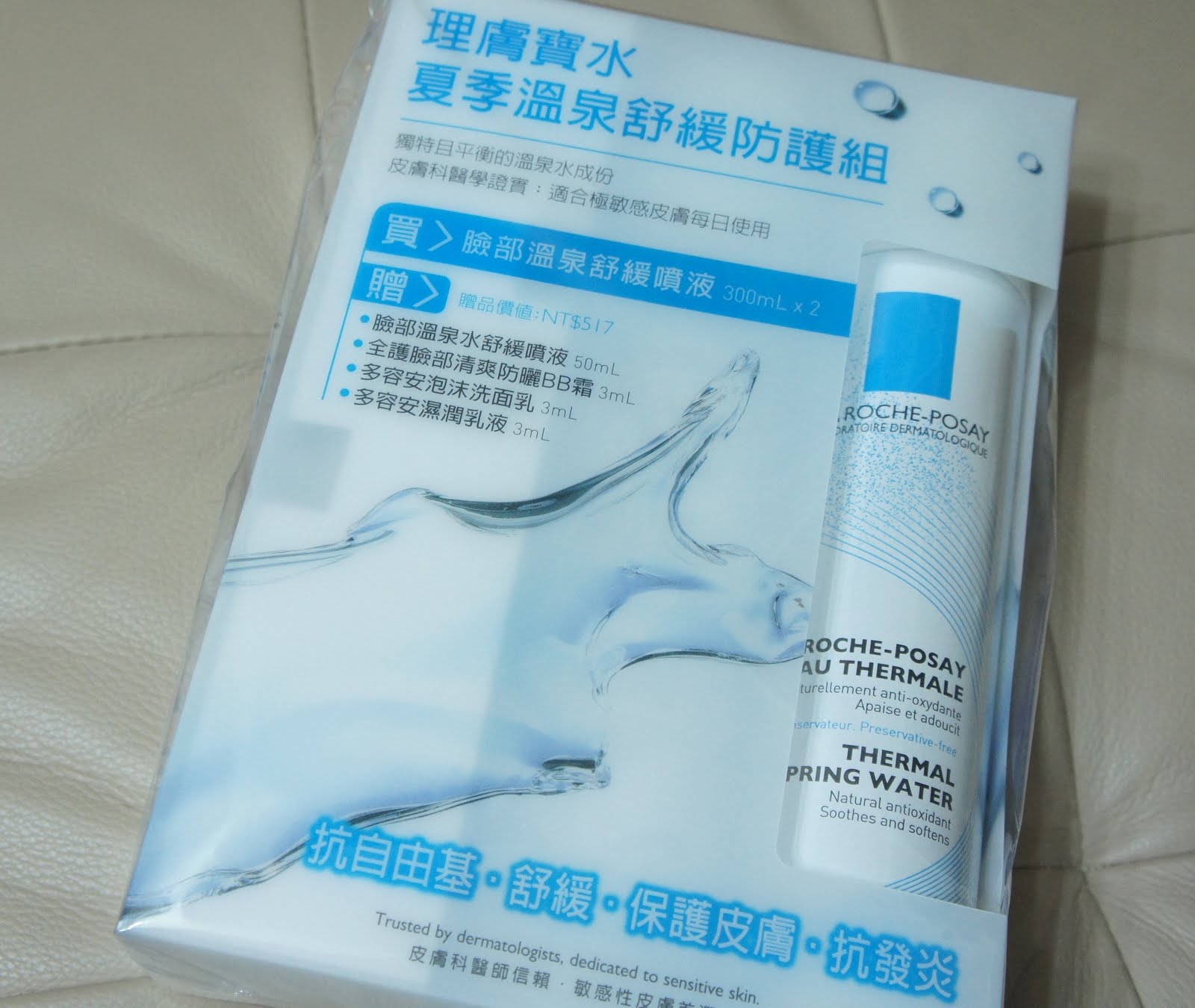 而JJ從網站裡得知『理膚寶水溫泉舒緩噴液』裡所含的硒,是三罐活泉水當中含量最多的一罐,當然最後讓JJ考慮的是『雅漾舒護活泉水』及『理膚寶水溫泉舒緩噴液』,剛好二項產品在酷熱的夏天都有特惠組合;而JJ已年過30,對於抗自由基的效果及減緩過敏的效果是JJ所追求的,所以隔天就前往新光三越把『理膚寶水溫泉舒緩噴液』組合(特價1200元,內容物有2罐300ml的舒緩噴液、1罐50ml的舒緩噴液、全護臉部清爽BB霜3ml、多容安泡沫洗面乳3ml及多容安濕潤乳液3ml)帶回心愛的家。