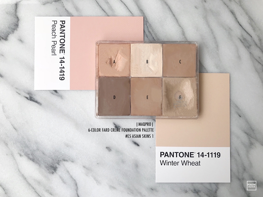 Maqpro 是我第一個入手的膏狀底妝,記得當初大沛介紹過後有一度大缺貨很難買。我買的是 E5 Asian Skins 1 (黃種人皮膚),Maqpro 的六色盤顏色算是滿廣的,另外還有 Asian skins 2 , caucasian skin (白人皮膚), darker skin (深色膚色)。膏狀粉底的好處是,只要買對色盤,你都可以隨著季節變化膚色的轉換,調出完全貼合自己膚色的顏色。我的膚色大概是 MAC 的色號NC20-25之間,用右下角 F 完全就是我的顏色,不用另外調色。可以看得出來我有多愛它,中間已經用到見底。左上角 A 是偏橘的珊瑚色,很適合拿來遮黑眼圈。偏白比較淺的B可以拿來局部打亮,或是冬天膚色比較白的時候可以拿來把底妝調淺。剩下的 C, D, E 我比較少用到,有在修容或是膚色比較深的女孩可以用它來調色。