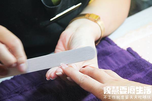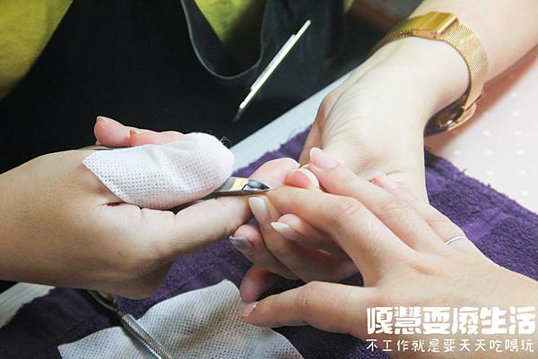 一開始會先貼心地修磨指甲的型及多餘的邊角。讓整體看起來比較圓滑。手法非常細緻,來『朵莉美甲美睫』好好放鬆享受美甲的過程。