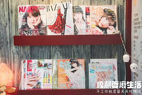在等待的時間,大門旁邊架上有雜誌可以先放鬆一下。每本雜誌都有許多款式,一個月來做一次美甲的,可以提前來看雜誌。