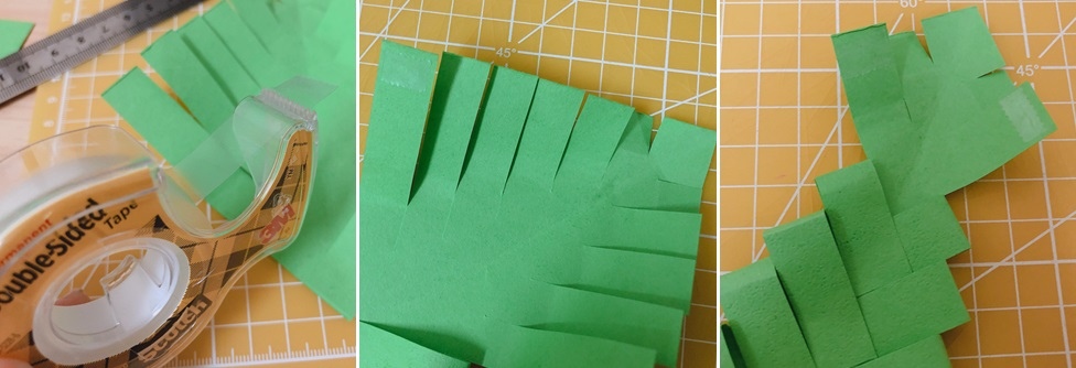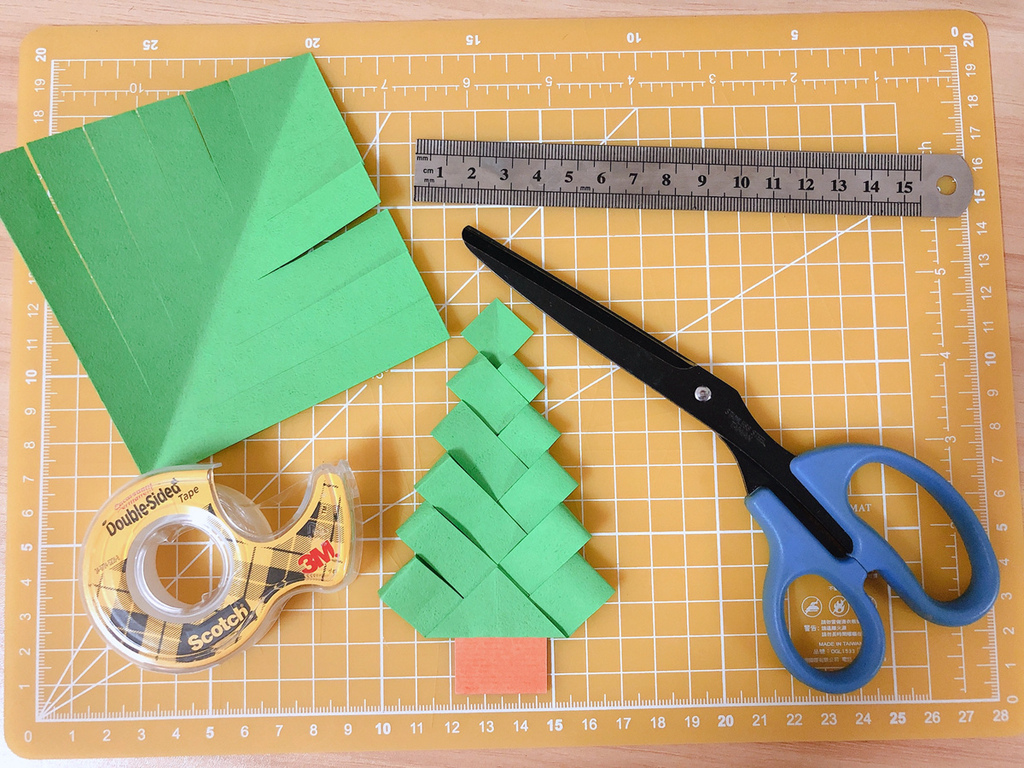 耶誕節快到了,準備綠色正方形紙張、咖啡色小紙張、剪刀、雙面膠帶,就能做棵耶誕樹囉。