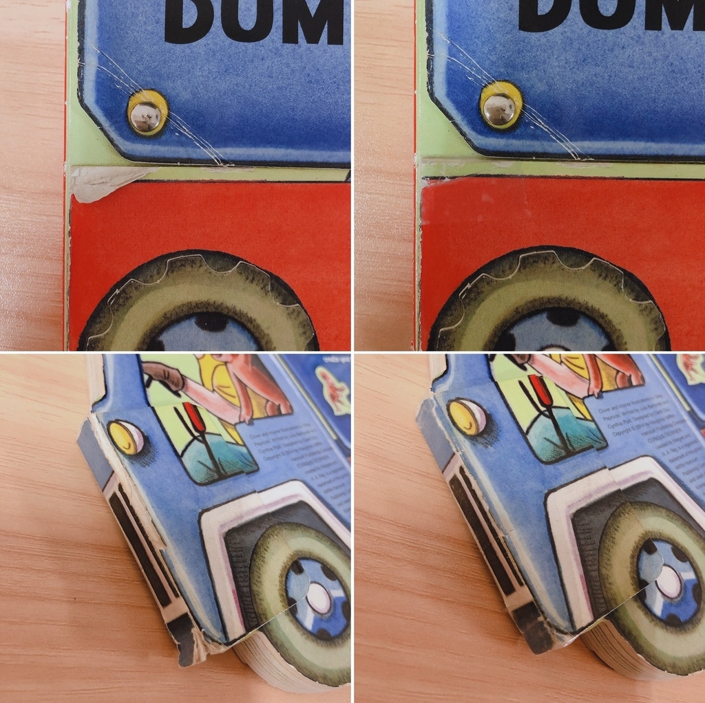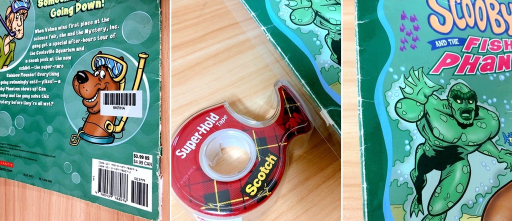 小朋友的故事書,真的蠻容易傷痕累累,拿膠帶進行修補,才不會越來越破越嚴重~