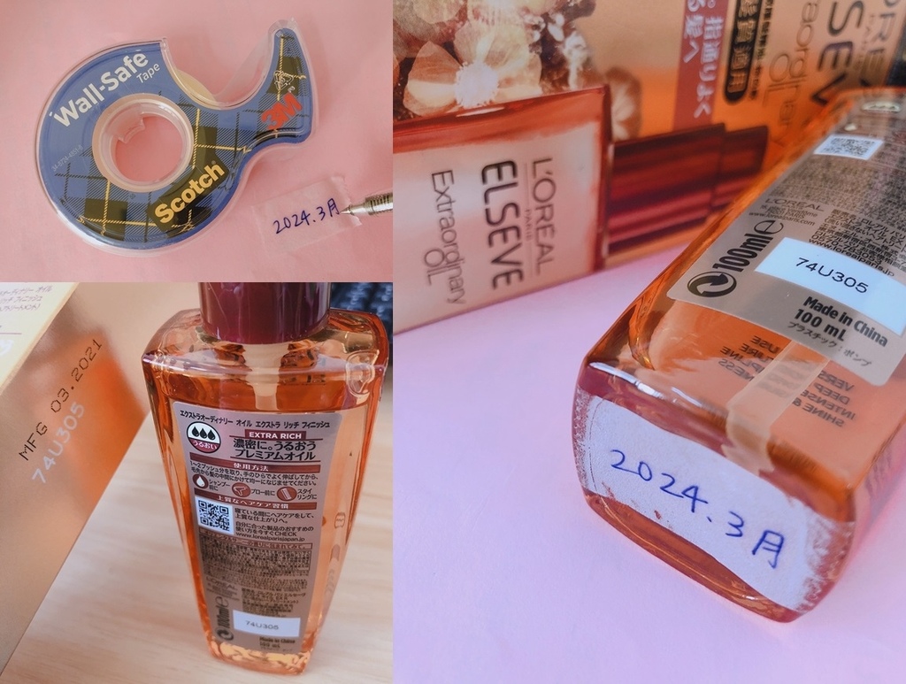 外盒才有製造日期跟效期,但一拆封使用就不會留包裝盒了呀,就把效期寫在膠帶上,用一般原子筆就可以順利寫上囉,寫好後再貼在瓶罐上吧。