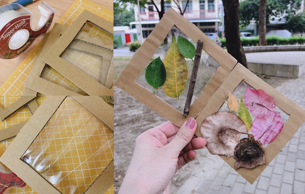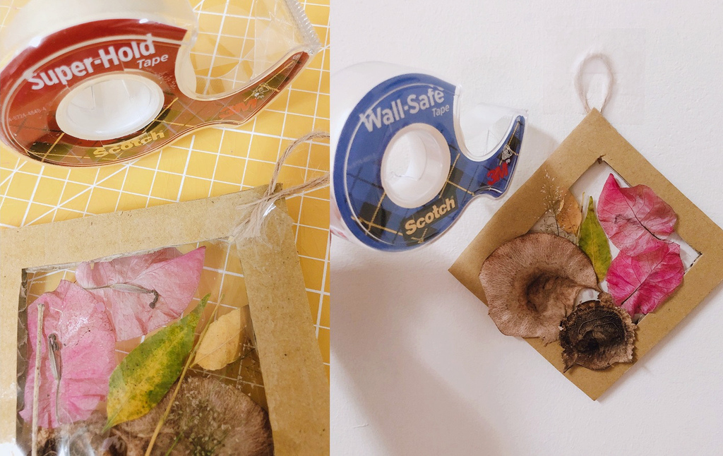 大自然的材料千變萬化,隨著季節也有所不同。這個簡單的創作,很適合帶著小小孩一起玩唷!先用紙箱割出畫框形狀,再用膠帶貼滿其中一面,接著就能到公園散步找素材創作囉。