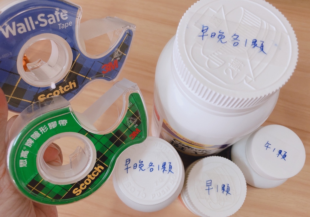每天要吃的保健食品太多了,魚油、鈣、B群、蔓越莓錠...等等。我這小腦袋瓜總是記不住,而且每次要吃之前,光是看包裝貼紙上的小字,就覺得眼力大失,太傷眼了呀。在蓋子上做標籤最合適啦~ 而且瓶蓋不是平整的,直接寫在膠帶上,再貼上去,完美:)))