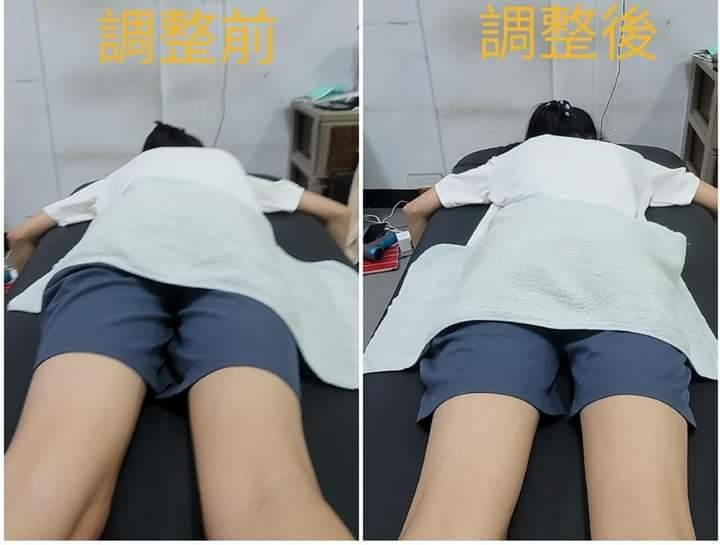 這次去元強仙骨微調後,可見調整後骨盆回正、腿長視覺差異明顯改善,雙腿放鬆度也更對稱。